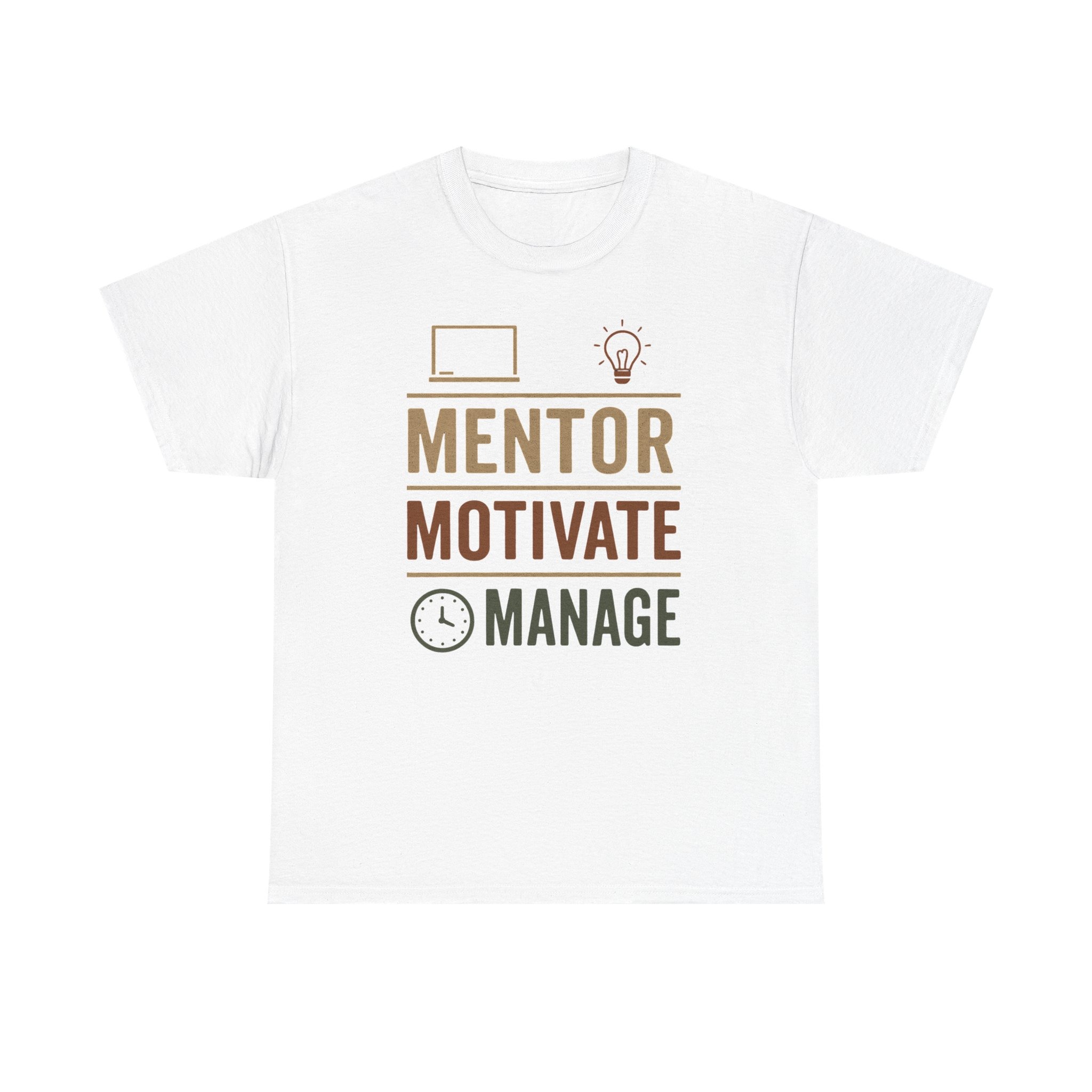 Mentor Motivate Manage Cotton Tee featuring stacked block text in earthy tones with icons of a laptop, lightbulb, and clock – bold unisex design for modern educators