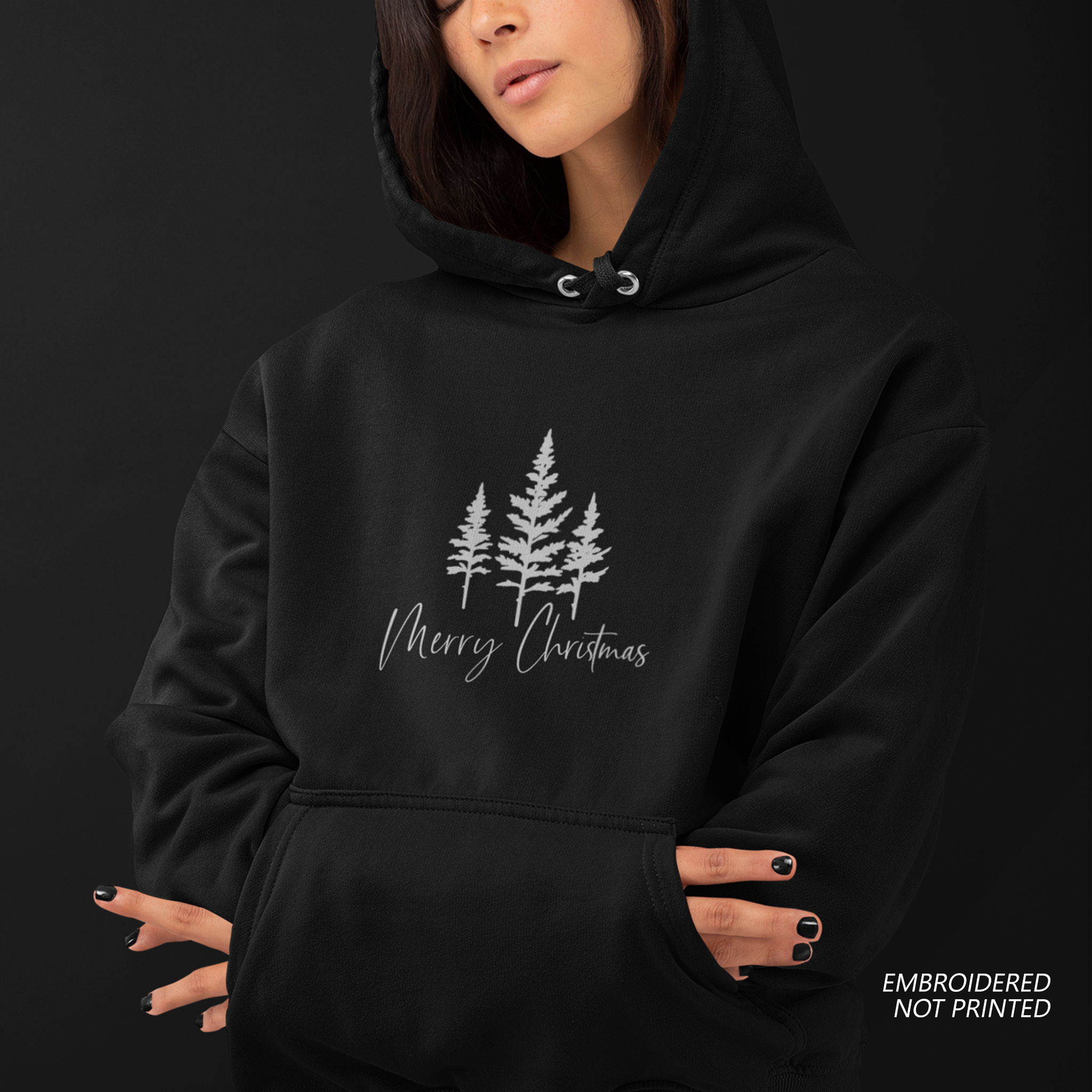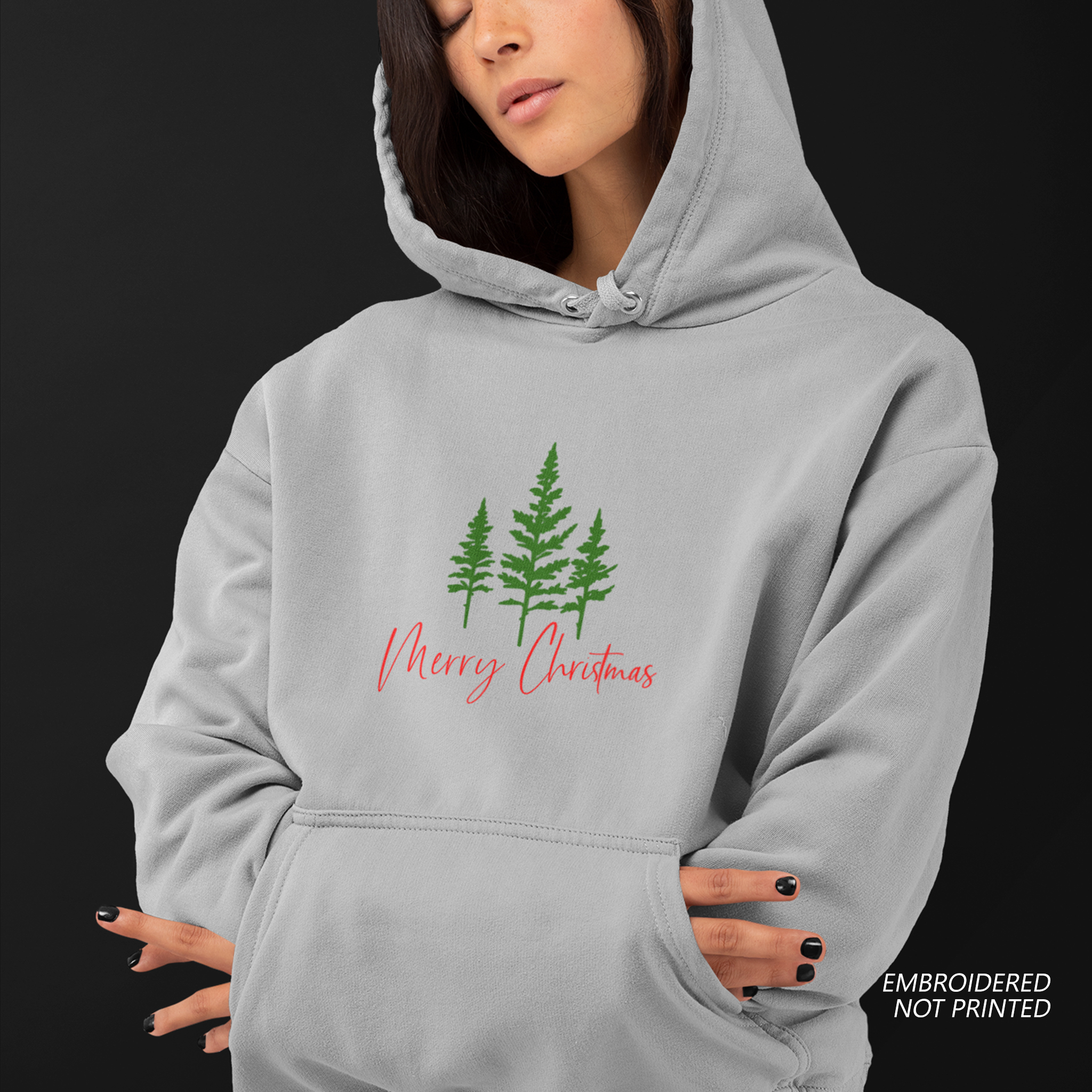 Crafted with premium materials and detailed embroidery, this Merry Christmas Embroidered Hoodie hoodie features three festive evergreen trees and a beautifully stitched Merry Christmas script—giving you a classic Christmas look that stands out from ordinary printed designs.